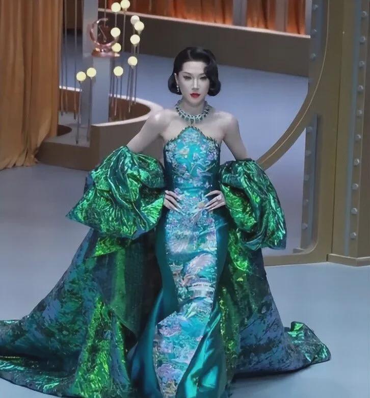 一身蓝色镂空刺绣礼服配上祖母绿披肩,精修图里活脱脱一个豪门贵妇。